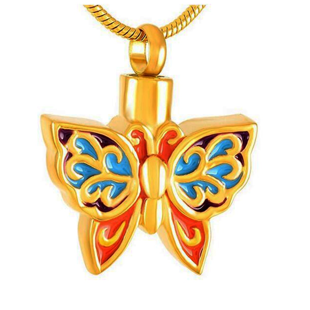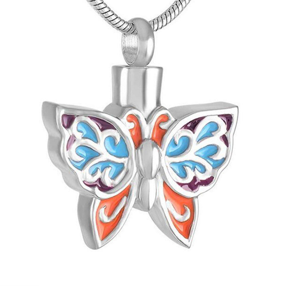 The Uhke range of cremation jewellery are pretty pendants made from stainless steel and comes in four lovely colours, each with a colourful butterfly design.